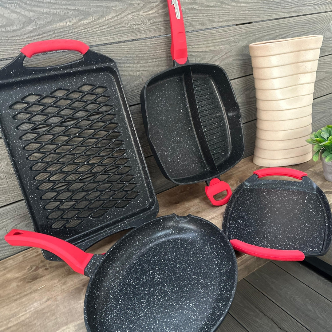 Fabricadas con revestimiento antiadherente y mangos ergonómicos de silicona roja resistentes al calor, ofrecen un diseño moderno y funcional. Compatibles con todo tipo de cocinas, son el complemento ideal para chefs principiantes o expertos.